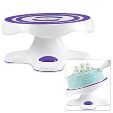 | Description | There’s never been an easier and more convenient way to reach every part of your cake. With the Tilt-N-Turn ULTRA Cake Turntable, you can choose between 18 different plate angles, making it easier to decorate the sides and top of your cake. Perfect for placing cut out designs, piping, borders, writing and more! Non-slip soft grip design molded into plate surface securely keeps cake in place. Tilting mechanism provides 18 different secure plate positions, with large push button for easy plate adjustment. Top plate smoothly rotates in either direction for left- or right-hand use, locking into place when desired. 5 in. or 12.5 cm high, durable construction with balanced base weight and non-slip feet to keep turntable in place. |
