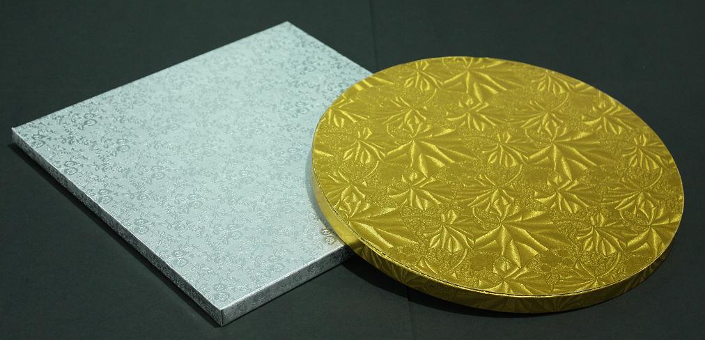 | Description | Made of corrugated paper designated in many layers to make a thick and light cake board. Available in silver and gold colors both square and round (price the same). The sizes available is: