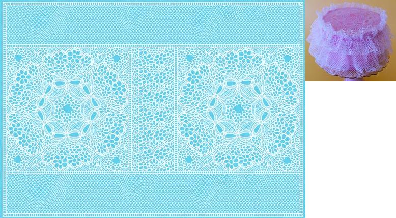 | Description | Multitudes of flowers in circular patterns for creating both round and square 6" intricately detailed cake tops, with long strips of fine netting for adding side details. Smooth Tricot Mix over the incised designs. When set, peel beautiful lace lengths to wrap around cakes, and cupcakes, or cut sections from the lace to place on cookies, chocolate, and other desserts. |