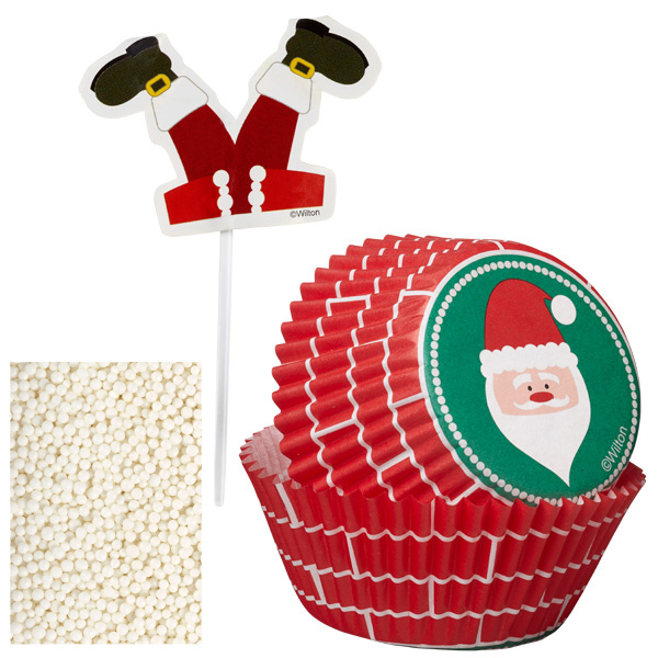 | Description | Santa's stuck in the snow! Wilton's cupcake decorating kit has Santa upside down in your cupcake! Fill the chimney themed baking cups with your home baked cupcakes, ice, and add snow sprinkles before adding Santa, head first!