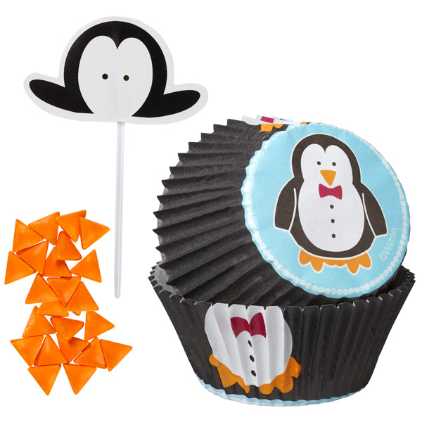 Adorable penguin baking cups, penguin picks and orange beaks dress up your winter treats!