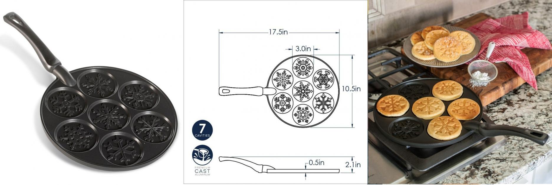 | Description | Sweet snowflakes adorn this pancake pan. With seven cavities, you can