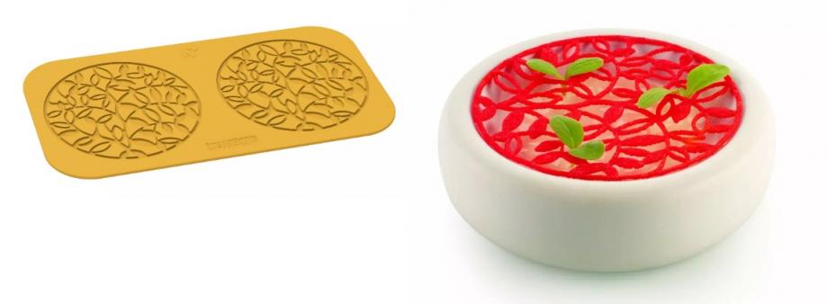 | Description | Esotico can be used with both tuile and chocolate to create elegant and refined decorations. It is perfect for decorating first and second courses or for adding a refined touch to plated desserts. You can also cut the silicone mat according to the guideline shown for even more practical use. Mould dimensions: 320x170 h 2.5 mm / 12.6x6.7 h 0.1'' Cavity dimensions: ø140 h 1.7 mm / ø5.5 h 0.07'' |