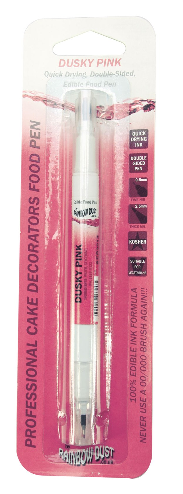 | Description | Rainbow Dust's food Pens are filled with edible ink. The Pens have a standard pen style 2.5mm nib which can be used for standard work and a fine 0.5mm nib for the fine detail such as adding facial features and intricate details. |