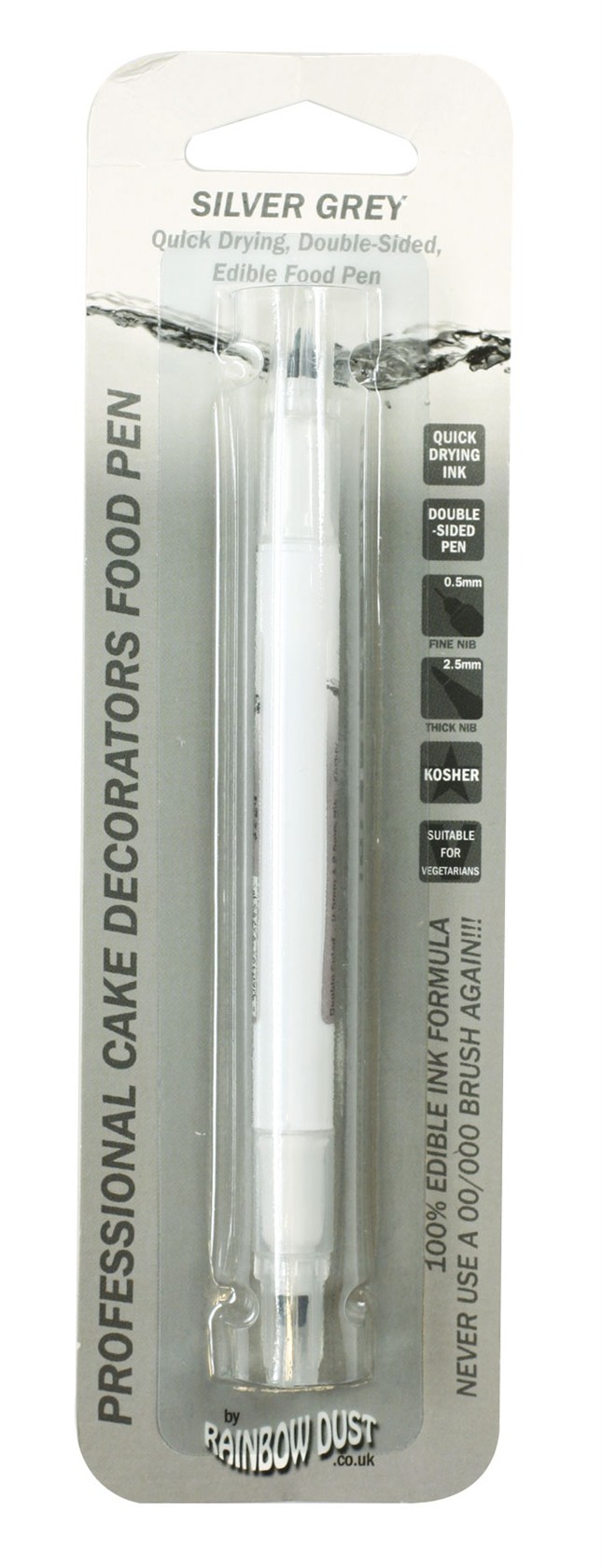 | Description | Rainbow Dust's food Pens are filled with edible ink. The Pens have a standard pen style 2.5mm nib which can be used for standard work and a fine 0.5mm nib for the fine detail such as adding facial features and intricate details. |