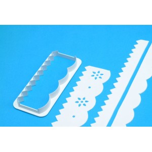 | Description | Broderie Anglaise plastic Straight Frill cutter, used in conjunction with eyelet cutters for creating the effect of lace and embroidery using sugarpaste, gumpaste, marzipan etc. As you can see in the picture, the middle part of the fondant has the shape of six petals, which using the six petals eyelet cutter and also round eyelet cutter |