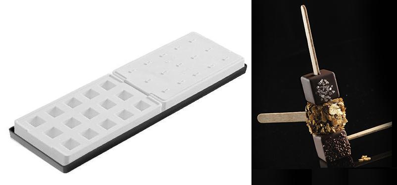 | Description | The kit allows you to create mini appetizers and canapčes cube shaped, cold or cooked. It is composed by two silicone moulds and two silicone covers and is designed to ease and stabilise the insertion of the sticks. It is conceived to realize in one time 30 one bites. Details: MST01 Mini Kube: size: 20 x 20 h 20 mm; volume: 8 ml x 15 = 120 ml Set 2 pz MST01 + tray 119 x 395,5 h 12,5 mm + 50 sticks |