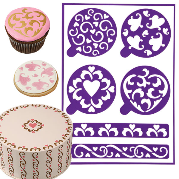 With four round cupcake-size designs and two linear designs, you can use them to decorate cookies and cupcakes. Since they're easy to reposition, you can even use them to stencil on the sides and top of a cake. Stick-N-Stay stencils work well on fondant and Color Flow and royal icing. It attaches to Candy Melts candy so you can decorate your candy-topped creations as well.You can stencil with so much variation – use Pearl Dust edible accents or Color Dust edible accents or Color Mist food color spray to add color to the designs or create designs by applying melted candy, thinned royal icing or tinted buttercream icing to fill in the stencil openings. The tabs on each stencil make it easier to position and to remove after use. Four round heart designs range from large heart medallions to an all-over scroll and heart design perfect for covering surfaces large or small. Linear designs include a delicate intertwined scroll and fleur-de-lis-inspired motifs. Round designs are perfectly sized for the top of a cupcake or cookie at 2.5 in. (6,35 cm) dia.; linear designs measure approx. 5 in x .75 in. (12,7 cm x 1,9cm). Since the stencils are washable, just rinse between uses. To protect adhesive side, return stencils to backing sheet for storage. Made in Taiwan. |