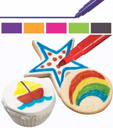 | Description | Use like ink markers to add fun and dazzling color to countless foods. Kids love 'em! Decorate on fondant, color flow, royal icing designs and cookies. Brighten everyday foods like toaster pastries, cheese, fruit slices, bread and more. Fine tip. Set includes Purple, Orange, Pink, Light Green and Black .35 oz. FoodWriter pens. Certified Kosher. |