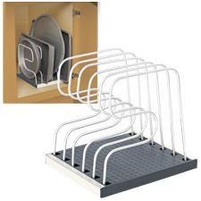 | Description | No more struggling to find the pan you need! The Adjustable Bakeware Organizer keeps your pans separated and easy to grab. Powder-coated wires adjust to organize cookie sheets, pizza pans, cutting boards and more. Mounts vertically or horizontally to maximize your cabinet space. Includes six adjustable wires, four mounting screws and base. Assembled dimensions: 10 x 8.5 x 8.75 in. |