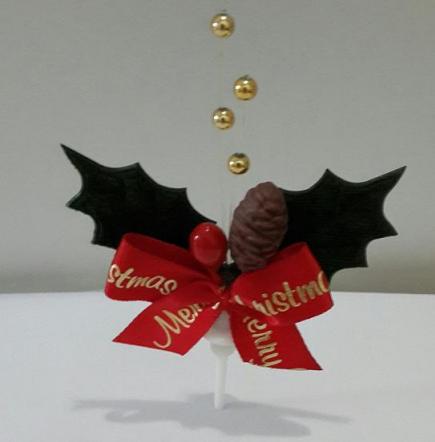 HOLLY PICK W/ RIBBON AND GOLD ORNAMENTS - 6 X 6 CM