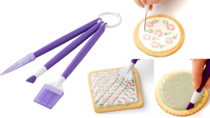 | Description | Decorated cookies with detailed wet-on-wet royal icing. The Cookie Flooding Decorating Kit includes 3 precision cookie decorating tools specially designed to help you achieve professional-looking royal icing cookie decorating techniques. Use the etching tool to drag icing, create marbling and feathering, add detailing, and smooth air pockets. Use the 3-pronged comb tool to marble and pull colors using evenly spaced, clean lines. Smooth edges and remove excess icing using the silicone scraper tool.