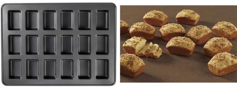 | Description | Bake 18 perfectly-shaped mini loaves using one pan with the Perfect Results 18-Cavity Mini Loaf Pan. This extra-large mini loaf pan is uniquely sized to maximize the space of your oven, so you can bake 18 mini loaves using only one rack of the oven and only one pan. The 15 in. x 21 in. (38,1 cm x 53,3 cm) pan fits most standard ovens. Non-stick, reinforced coating releases mini loaves with ease. These pans feel noticeably heavier than most comparable brands, assuring you that this bakeware will heat evenly for years of baking perfection. Dishwasher safe. 10-year limited warranty.