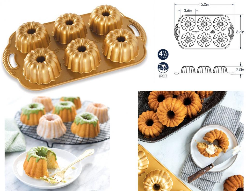 Bundt pan is a dessert maker's dream. 4.5 cups capacity. Use and Care: 1. Before initial use and after subsequent uses, hand wash with warm, soapy water. Extended soaking is not recommended. 2. Before each use, brush with butter or shortening and dust with flour or cocoa to coat. Baking spray containing flour may also be used. Do not use regular cooking spray. 3. Mixes and recipes may vary. Fill the pan no more than 3/4 full to avoid overflow. 4. Metal utensils, scouring pads and abrasive cleaners should not be used on nonstick surfaces. |
