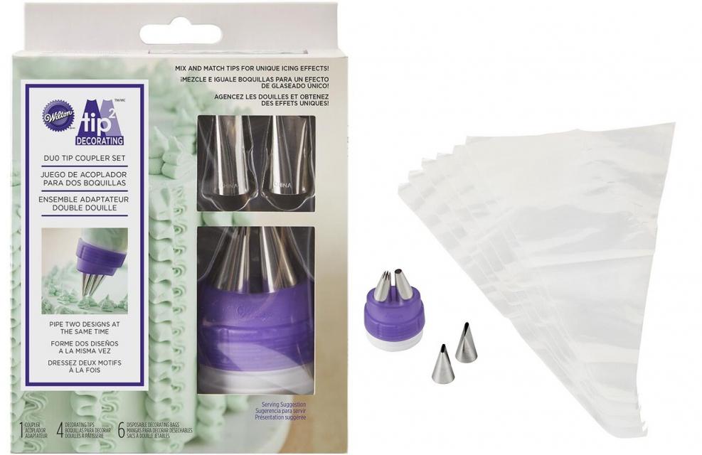 | Description | Get creative with your cake decorating skills when you use this duo tip coupler set. It allows you to use two different decorating tips at the same time to create two different designs. You won't ever want to put it down. Set includes: duo coupler, petal tip 104, star tip 22, round tip 10, basketweave tip 48 and 6 disposable decorating bags |