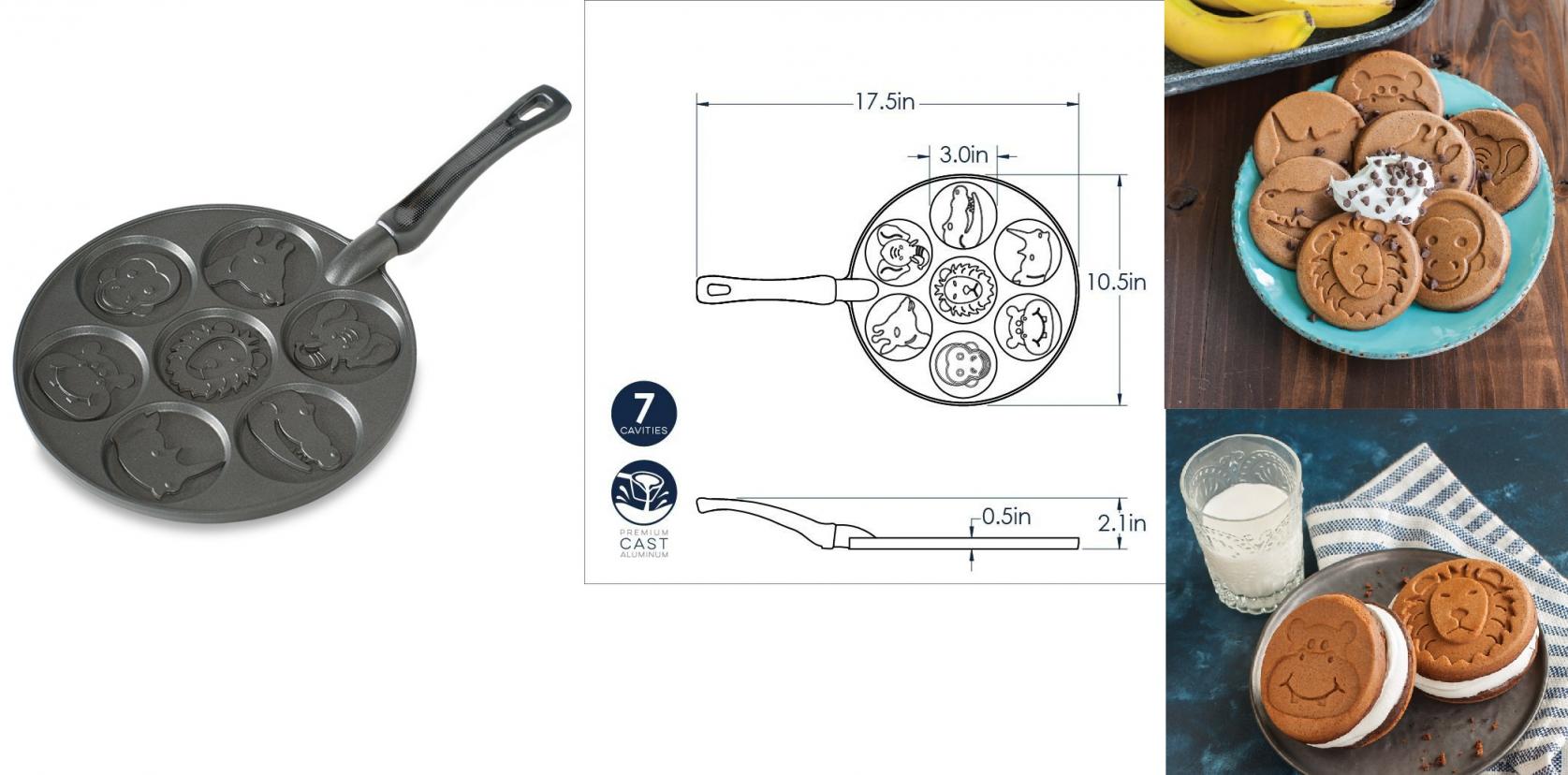 animals. A durable PFOA-free nonstick finish makes cleanup a cinch! Use & Care: 1. Before initial use and after subsequent uses, hand wash with warm, soapy water. 2. Preheat griddle over medium heat and brush with unsalted vegetable shortening or oil before each use. 3. Pour 2 Tbsp batter into each cavity and cook until the center bubbles and the edges become golden brown. 4. Flip each pancake with a non-metal utensil, and continue cooking until toothpick inserted in center of pancakes comes out clean. We recommend wooden skewers or chopsticks, a small silicone spatula or a plastic fork for flipping. |