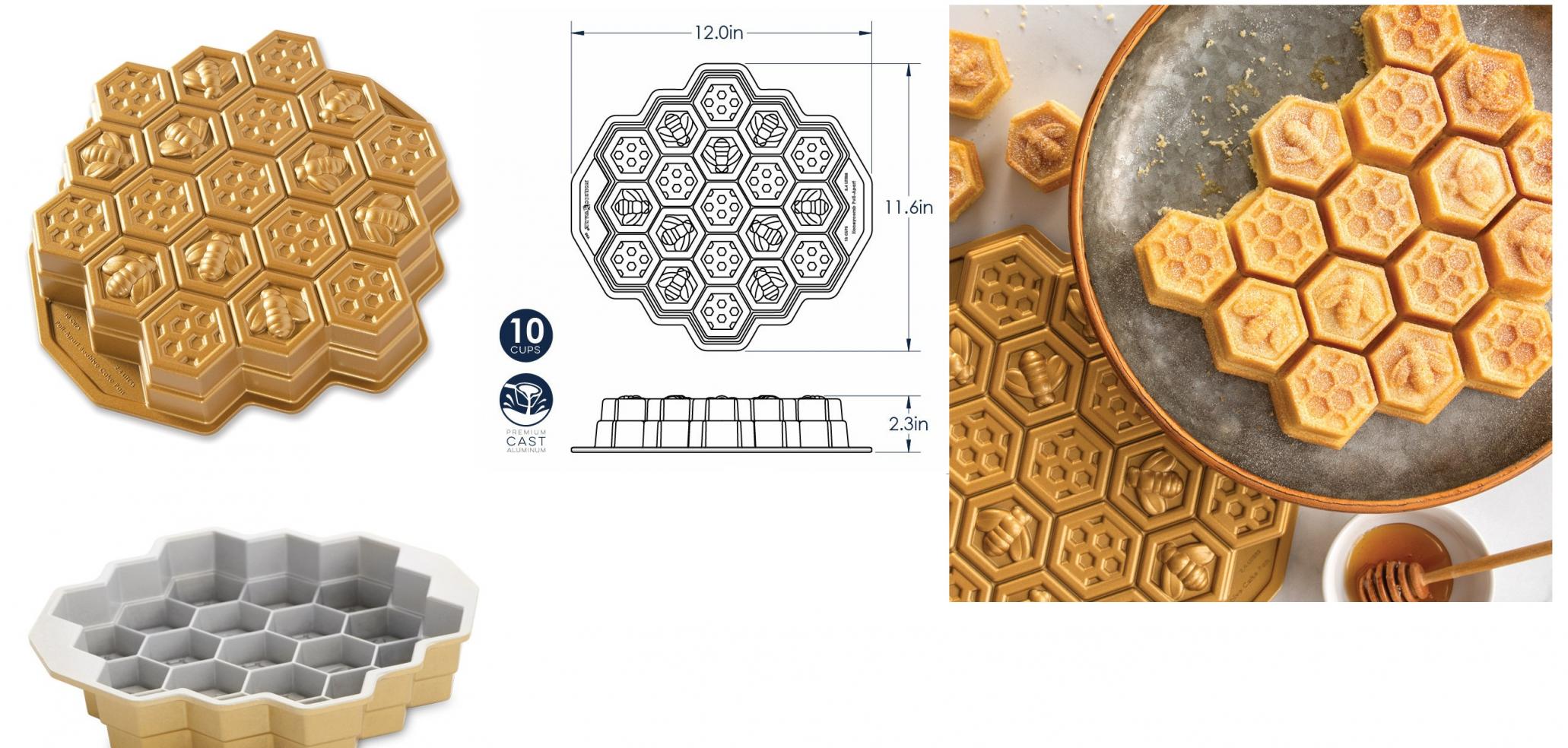| Description | There is a lot of buzz about bees! Create a honeycomb-inspired dessert that divides into 19 perfectly portioned cakelets. Use & Care: 1. Before initial use and after subsequent uses, hand wash with warm, soapy water. Extended soaking is not recommended. 2. Before each use, brush with butter or shortening and dust with flour or cocoa to coat. Baking spray containing flour may also be used. Do not use regular cooking spray. 3. Mixes and recipes may vary. Fill the pan no more than 3/4 full to avoid overflow. 4. Metal utensils, scouring pads and abrasive cleaners should not be used on nonstick surfaces. |