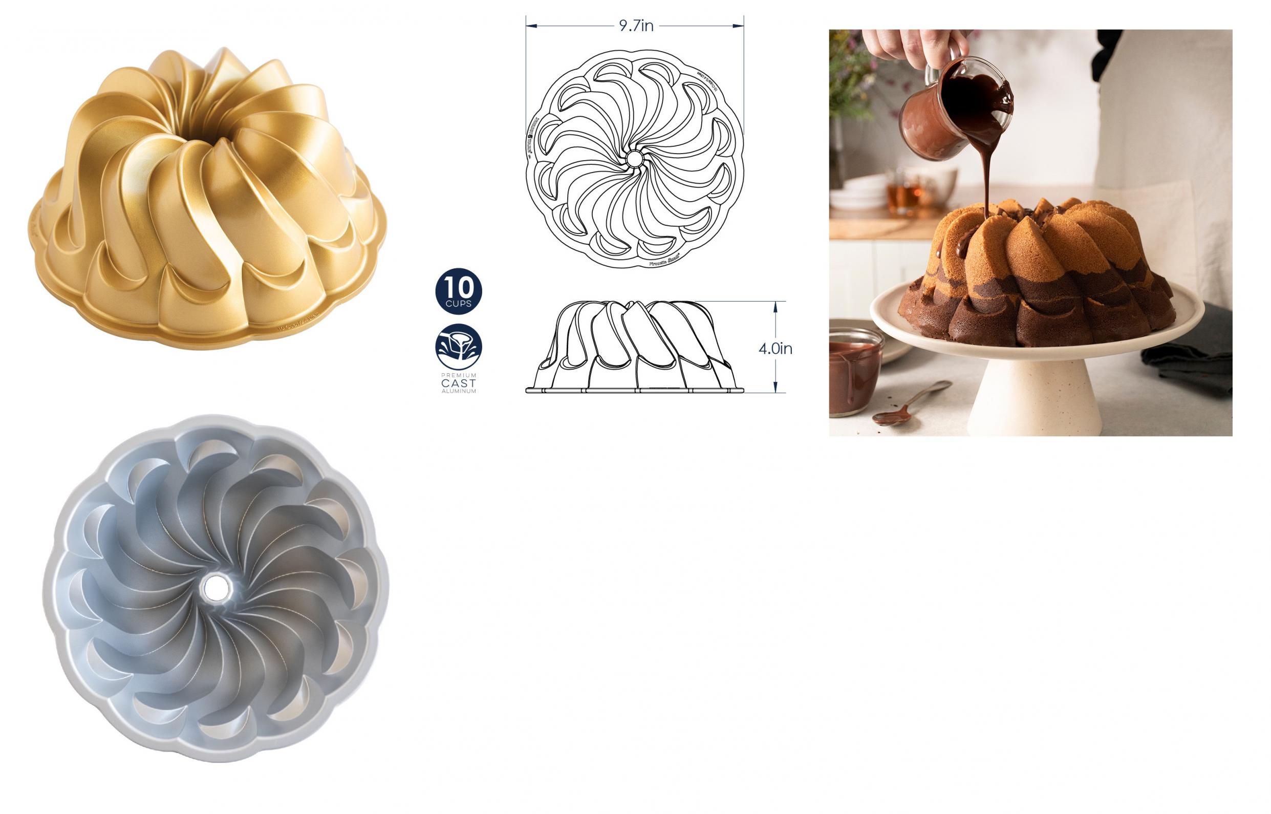 | Description | Introducing the Pirouette Bundt® Pan, a new and stunning swirl Bundt that’s named for the graceful spin of a dancer. This pan takes baked creations to the next level! Crafted of cast aluminum for superior baking performance, it imprints an elegant swirl pattern and fine details that are worthy of both oohh’s and awe. The premium nonstick interior guarantees quick release and easy cleanup. Beginners and professionals alike will enjoy baking in this stunning swirl pan. Though no frosting is needed, the cake can be enhanced with a simple glaze or dusting of powdered sugar. The Pirouette Bundt® Pan is fit for any occasion, from every-day to extra-special, and remember, Bundts are not only for dessert. Savory recipes abound in cookbooks and online too. Elevate your baking experience and delight in the joy of creating something grand when you bake in a Bundt!Nordic Ware designed, named, and trademarked the first Bundt® Pan in 1950 and continues to be the only manufacturer of genuine Bundt pans to this day. Our brand is recognized around the world for extraordinary design and superior quality. The Pirouette Bundt® Pan belongs to our Premier Gold Collection. It is made of cast aluminum and sustainably produced in America. Consumers are happy to know our premium nonstick interiors, that allow for quick release and easy cleanup, are PFAS-free. The exquisite new 10-cup